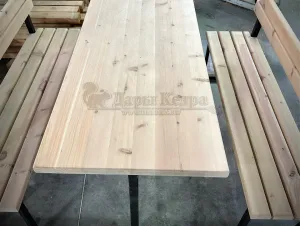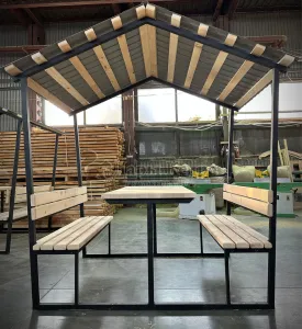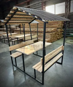 Беседка выполнена из стальной квадратной профильной трубы 40х40 мм. Лавки и стол обшиты кедровой доской. На крыше - ондулин. Беседка отличается простотой в установке, легкостью конструкции, долговечностью, прочностью и классическим дизайном, который впишется в любой интерьер приусадебного участка. Вокруг такой беседки можно организовать ландшафт из вьющихся растений, которые красиво создадут зеленые "стены" снаружи и уют внутри. Размер стола у разных моделей варьируется в зависимости от ширины конструкции.