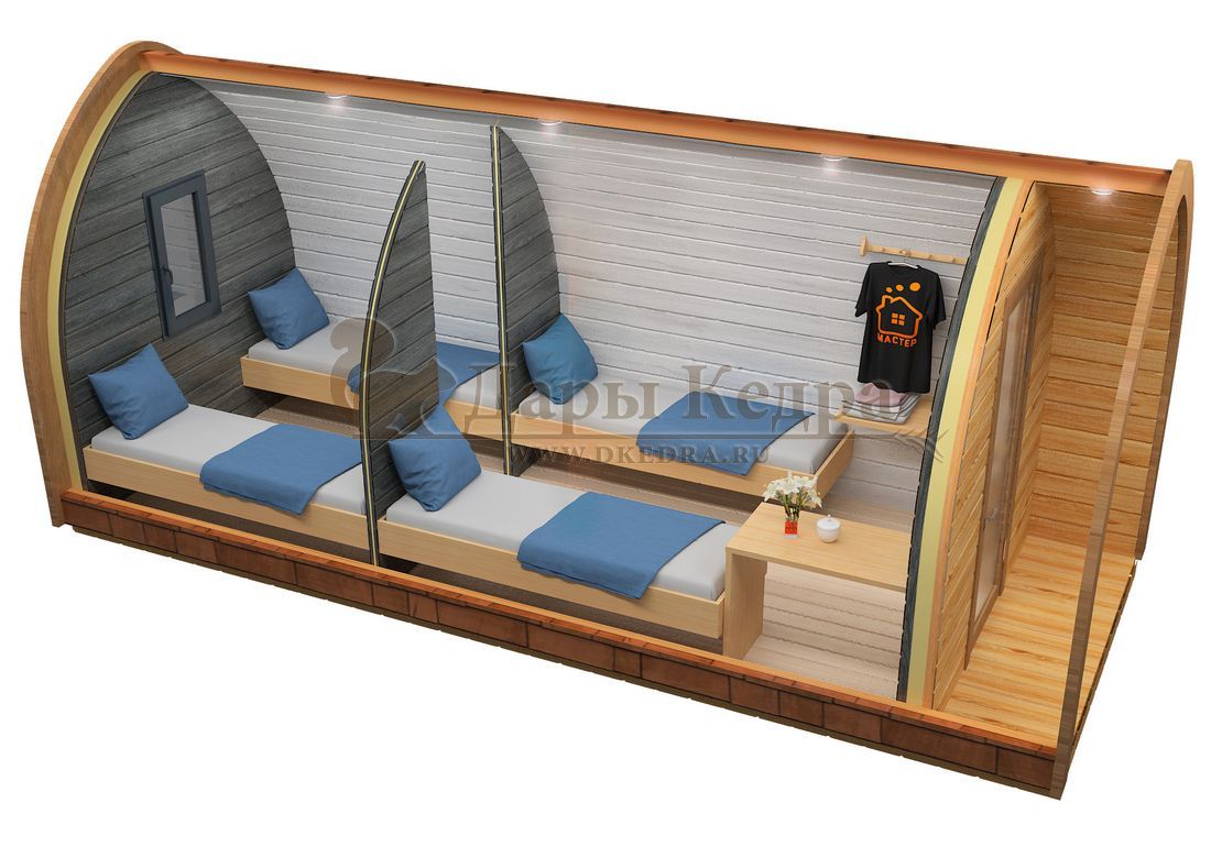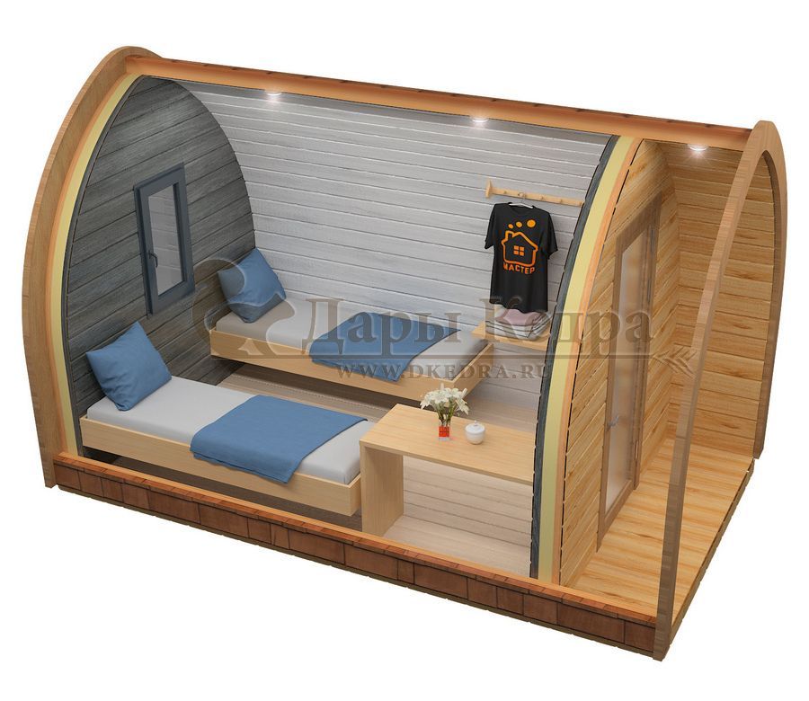 Кемпинг дом «Дуэт+» с боковым входом Такой кемпинг дом удобное и практичное решение для дачного использования или обустройства загородных баз отдыха. Увеличенные размеры и боковой вход со стеклянной дверью позволяют зонировать внутреннее пространство помещения. Домик включает в себя: Жилую зону с кроватями, столиком, вешалкой и полкой; Санузел с сантехникой, душевой поддоном и душевую стойку; Кемпинг дом изготовлен из хвойных пород древесины. Кровля из мягкой черепицы обеспечивают защиту от осадков.